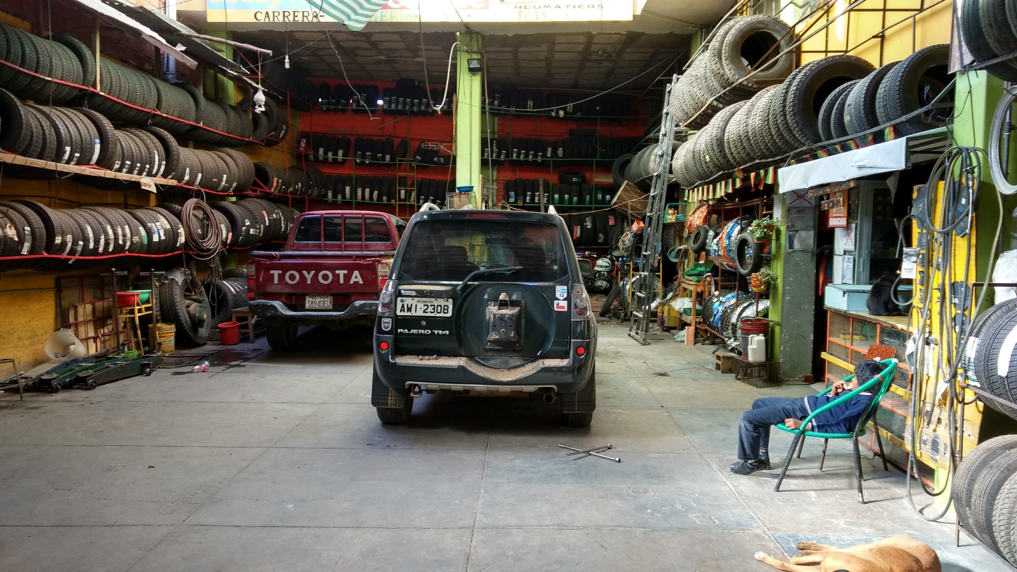 Pneu trocado, fomos a um banco, trocamos os dólares e agora, antes de ir para nosso hostel, precisávamos de uma gomeria. Procurando no google, descobrimos que havia uma na direção do hostel, e para lá fomos. Mais uma vez, fomos muito bem recebidos, o menino que efetuou o conserto do pneu, além de um penteado estiloso, pela aparência deveria estar na escola e não na borracharia. O serviço foi rápido, e aparentemente bem feito, com garantia e tudo - qualquer problema dentro de três dias, podíamos retornar ali.