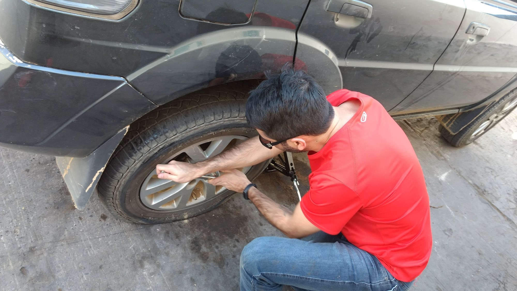 Muita calma nessa hora, o carro estava estacionado numa ladeira, rua estreita com calçamento de pedra, sendo quase impossível trocar o pneu ali. Com cuidado, dirigimos até uma rua transversal plana, paramos o carro, sinalizamos o local e iniciamos a troca. Foi preciso tirar as mochilas do porta malas para ter acesso ao macaco e demais ferramentas necessárias.