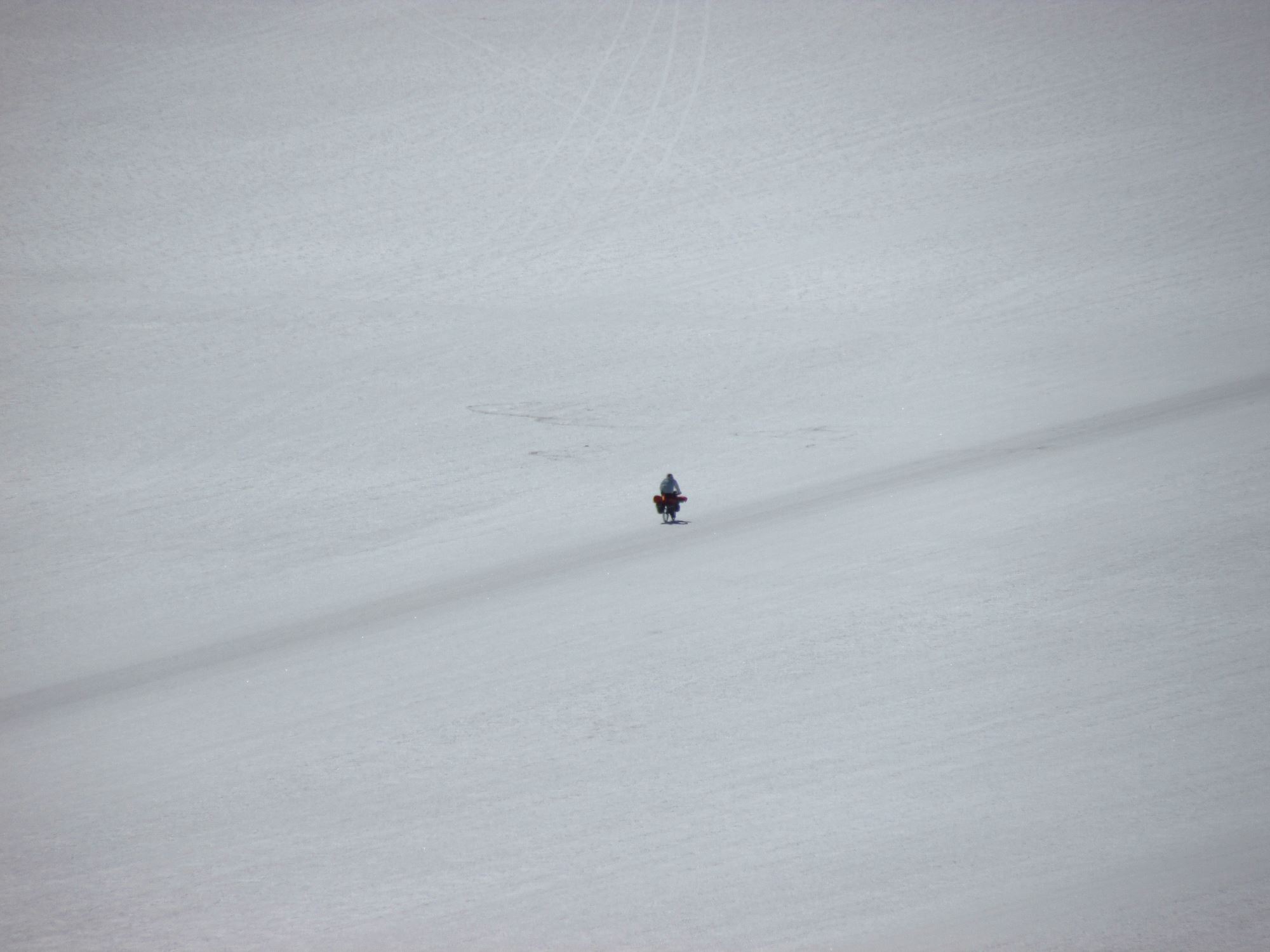 Nossa intenção, era fazer nosso almoço ali, porém, descobrimos que mesmo com fogareiro, não era permitido cozinhar, então fizemos apenas um pequeno lanche, comendo uns biscoitos e chocolates. Enquanto estávamos ali, avistamos um ciclista, e ficamos por um bom tempo extasiados vendo-o desaparecer naquela imensidão branca.