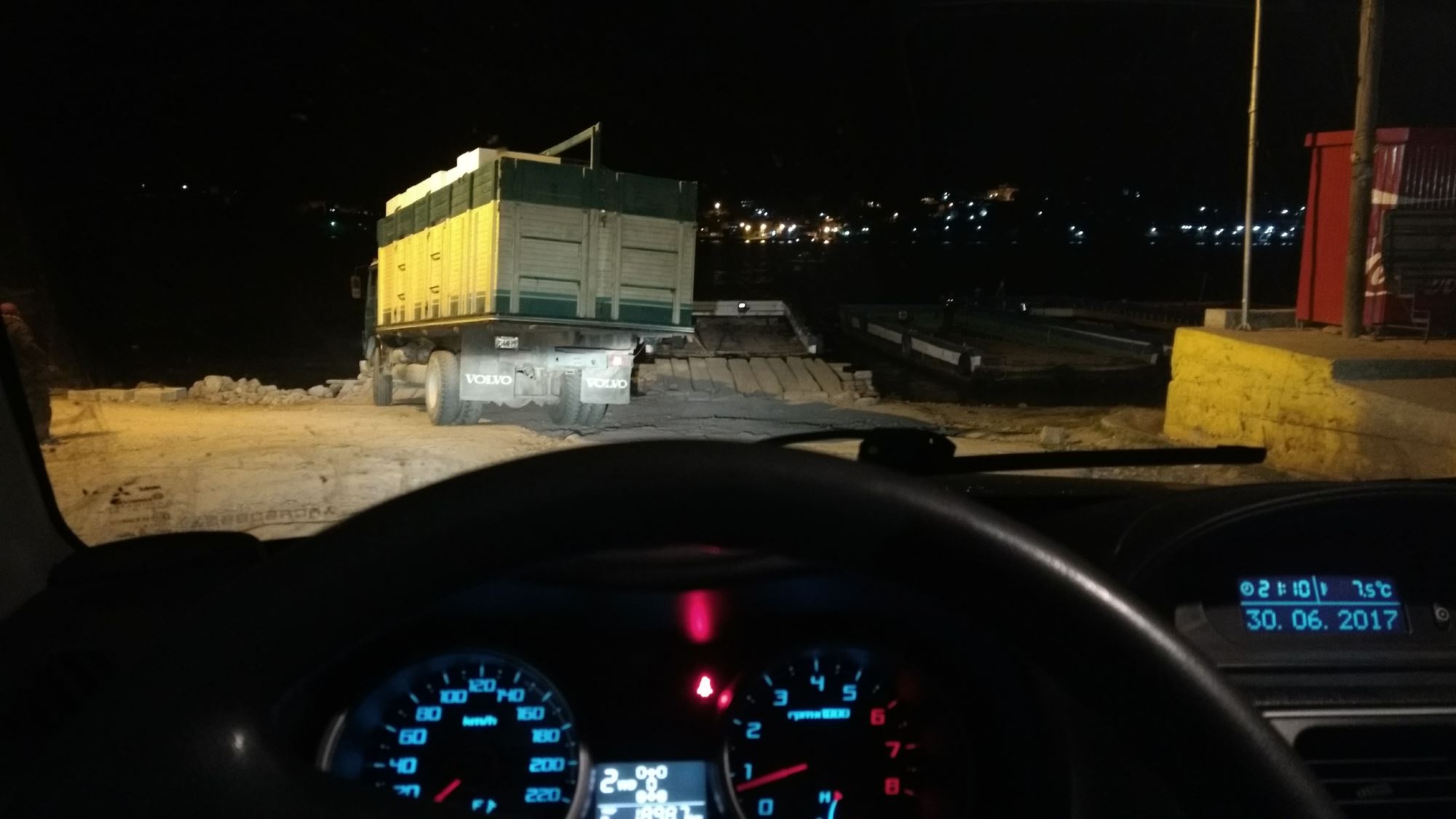 Mesmo cansados seguimos viagem noite adentro, precisávamos seguir o cronograma, tínhamos data certa para chegar em Cusco. Assim seguimos em direção a Copacabana boliviana, a estrada estava calma, ainda assim, por ser repleta de curvas, os KM demoravam a passar. Eu, de copiloto estava um tanto desconfiada do GPS, pois ele estava dando um tempo estimado para o destino do dia, muito longo, e não tinha tanta estrada pela frente, e não era mais tão cheia de curvas. Segui olhando desconfiada e aguardando qual seria a nova surpresa nas estradas da Bolívia e não é que chegou! A estrada que estávamos terminava em uma fila (três ou quatro caminhões baú, pequenos) aguardando para entrar em uma balsa. Tentamos uma rua ao lado, foi em vão, também terminava de frente com um lago. Eu desesperadamente disse “eu não vou atravessar isso a noite!”, hoje, relembrando a cena é divertido, na hora foi pavoroso para mim.